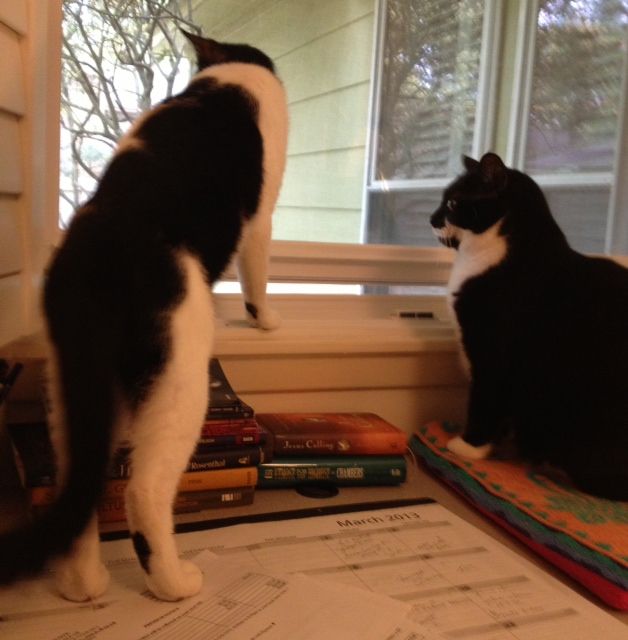 I have to share my studio window. At least this time they didn’t argue over who got there first. Tomboy is on the left watching squirrels with Abby Cat.