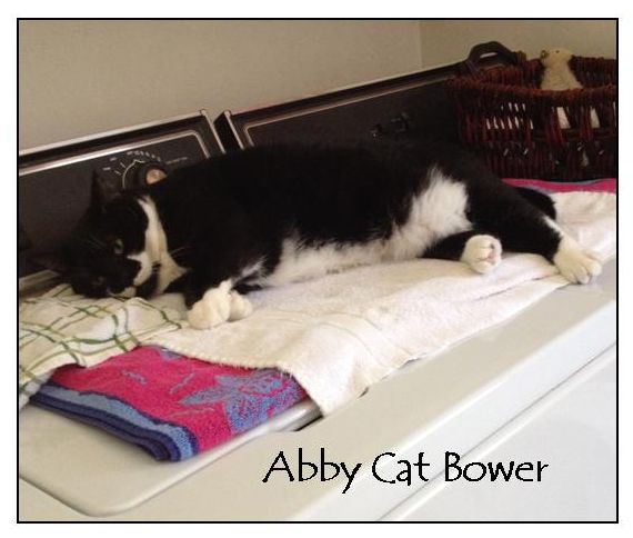 Meanwhile, I finished cleaning the kitchen and tossed the wet used towel on top the washer to wash later. Yeah, you guessed it; Abby Cat immediately jumped up onto the wet towel ON the beach towel, stretched out and stayed there until lunch.
