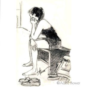 Emily taking break from the tour. Charcoal pencil sketch on paper by Adele Bower